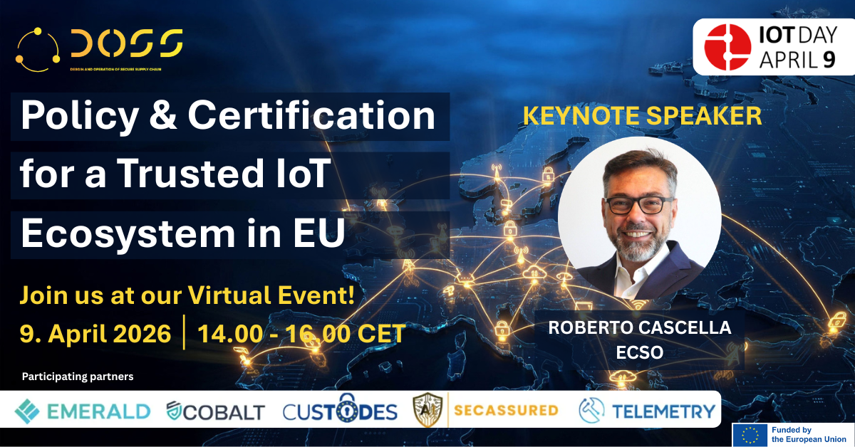 To celebrate the Global IoT Day , DOSS EU, EMERALD HE PROJECT, COBALT Horizon Project , CUSTODES EU Project, and TELEMETRY are organizing a free 2-hour webinar and roundtable to discuss how policy frameworks and certification mechanisms can evolve to support a secure, interoperable, and globally trusted IoT ecosystem.